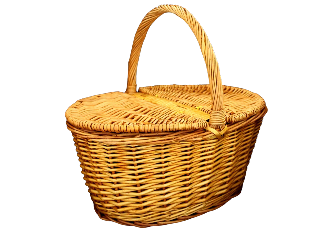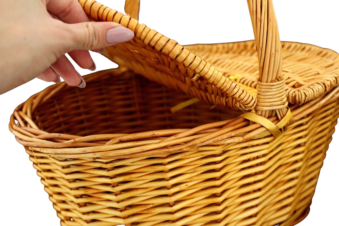 תיאור המוצר: סלסלת פיקניק מקש איכותי קלוע, עם מכסה שנפתח משני צדדיו וידית לאחיזה נוחה